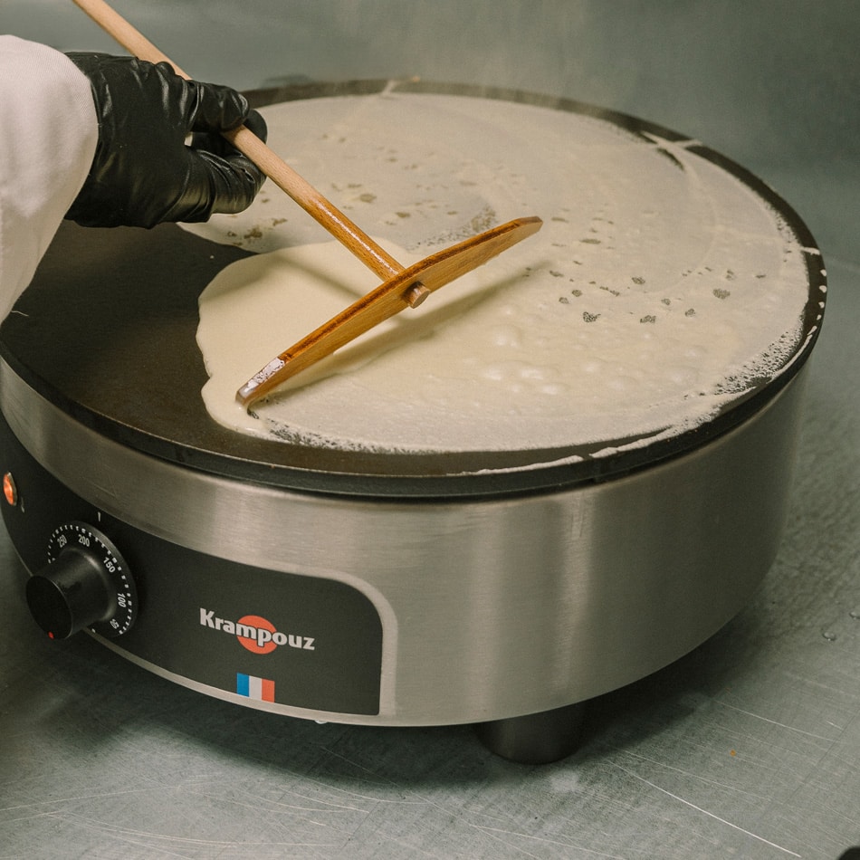 La crêpière Krampouz pour les professionnels, avec plaque en fonte émaillée, pour une utilisation sans culottage.