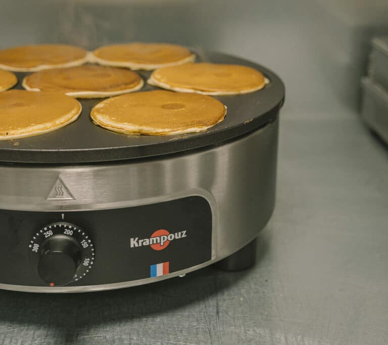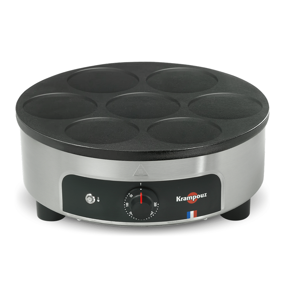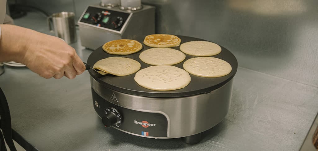 La première Plaque à pancakes Krampouz avec plaque en fonte émaillée pour des pancakes de taille homogène et régulière.