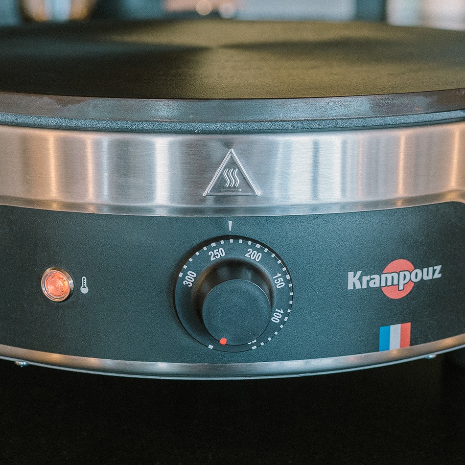 La manette de contrôle, développée sur mesure pour être plus robuste et plus résistante à l’arrachement, est graduée de 50 à 300°C permettant un réglage précis de la température. Très résistante, la plaque en fonte brute usinée ne craint pas les chocs. Le renfoncement sur la façade en inox permet de protéger le châssis des coulures de pâte afin d’en faciliter le nettoyage.