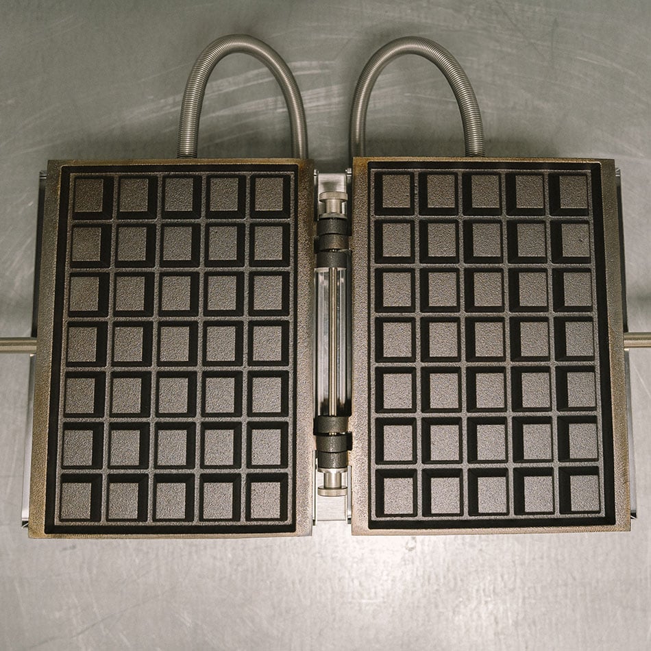 Parfaite répartition de la pâte sur les deux plaques grâce au système de basculement des fers.