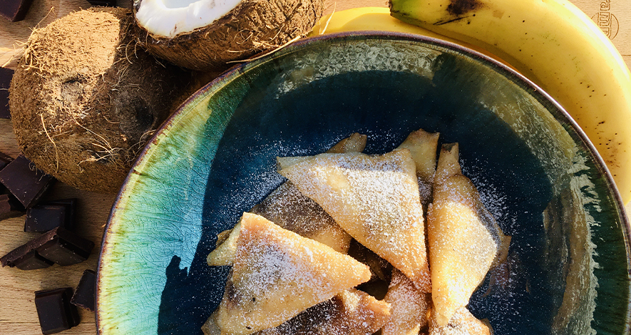 Disposer 2 carrés de chocolat et 2 rondelles de banane sur le haut de la feuille de brick. Plier la bandelette pour enfermer la garniture en formant un triangle.