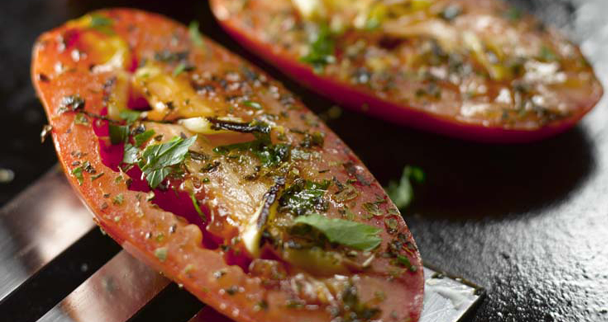 Faire cuire à feu doux sur la plancha les tomates côté chair 5 minutes. Les retourner et les arroser d’un filet d’huile d’olive. Les laisser cuire 5 minutes côté peau.
